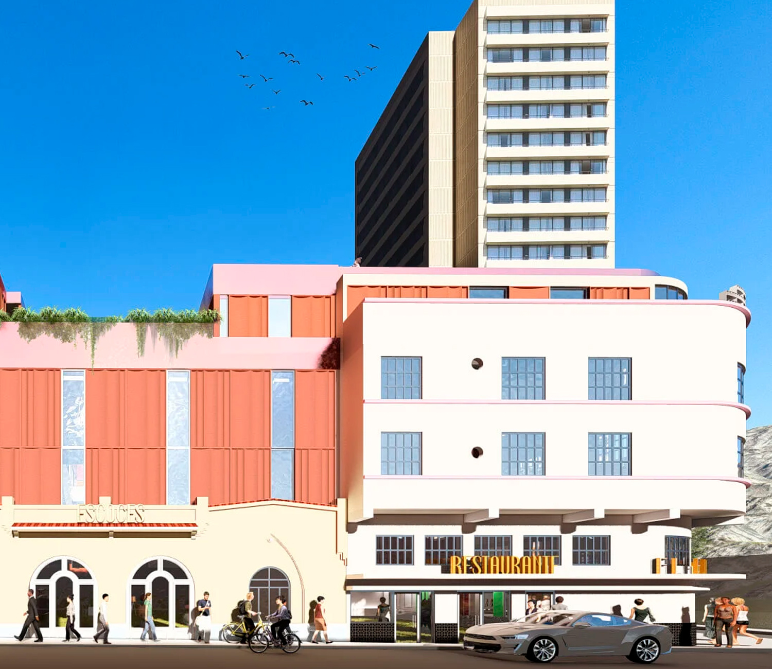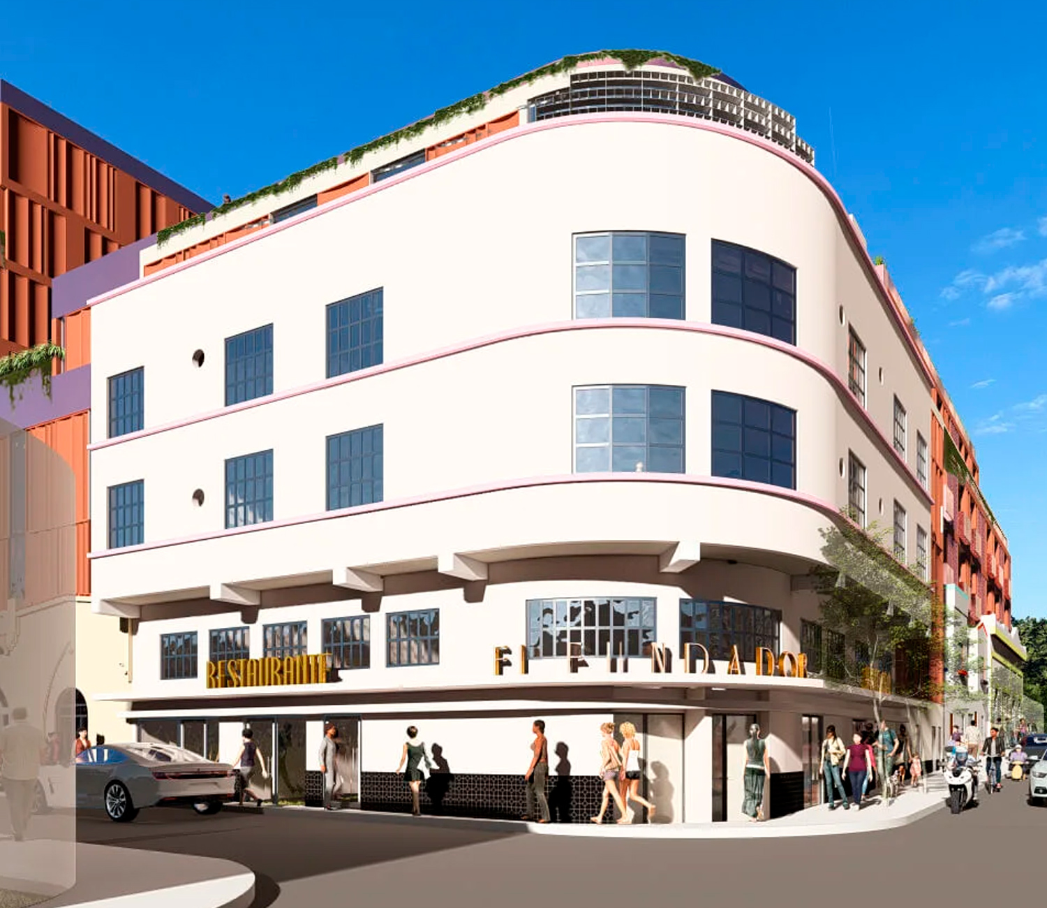 Uno de los ejes rectores del proyecto es la recuperación del patrimonio arquitectónico del sitio. El Fundador incluirá la restauración del hotel art déco, dos casas de estilo californiano y el icónico Bar El Escocés. El nuevo edificio de departamentos, de diseño discreto y sobrio, alcanza solo 8 niveles de altura, respetando así la escala del barrio. La planta baja se convertirá en un pasaje comercial que revitalizará la esquina donde se ubica, generando actividad y dinamismo para toda la zona.